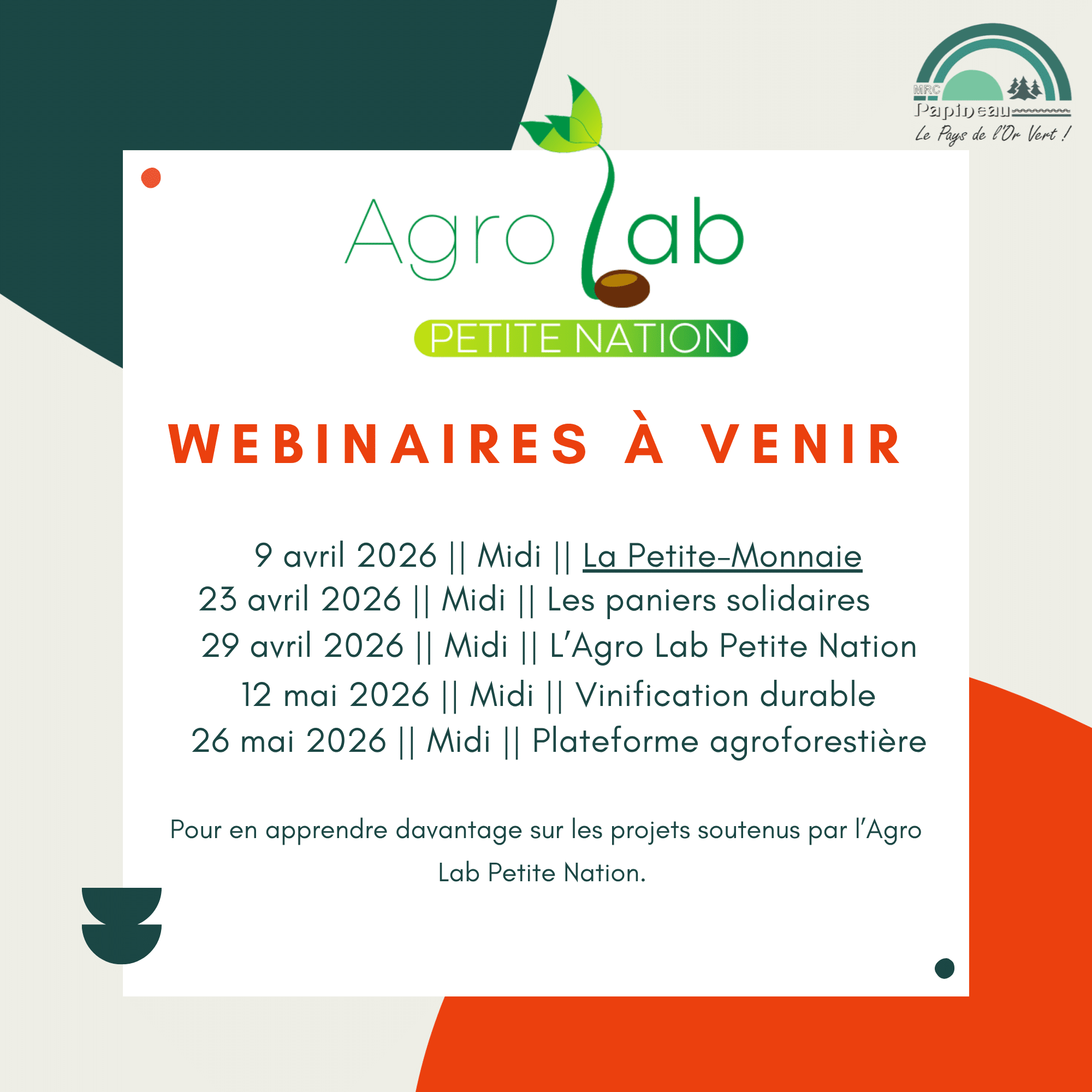 La MRC de Papineau organise une série de webinaires au printemps 2026 pour promouvoir davantage les projets soutenus et faire connaître l’Agro Lab Petite Nation.